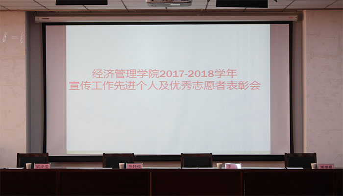 10月16日中午,学院于明向校区经管楼二层报告厅召开2017-2018学年宣传工作先进个人及优秀志愿者表彰大会。院党委书记李玮、院党委副书记杨振东、副院长陈怀超、学工办主任梁泽莹以及全体辅导员、学生干部和“三创赛”志愿者参加表彰会。大会由梁泽莹主持。