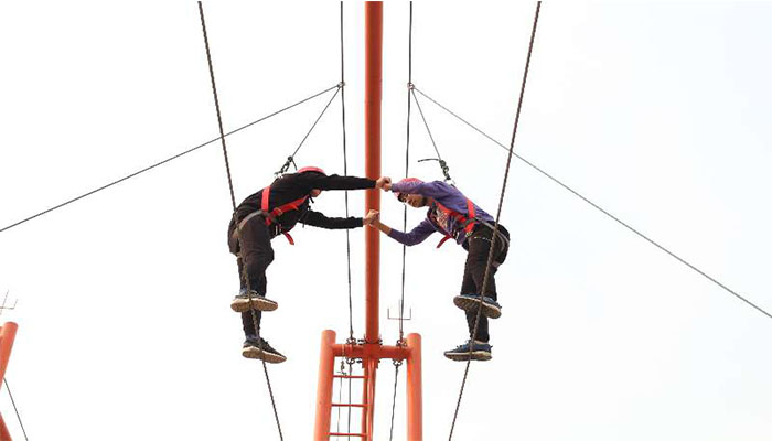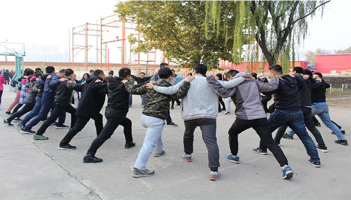 下午,在主带培训师于双转的激情引导下拉开了拓展帷幕。拓展项目涉及高空与地面,以团队协作居多,主要项目包括鼓动人心、天梯、高相依、盲人摸象、麻将江湖。大家集思广益,团结协作,分组竞赛pk一次次将拓展推向了高潮。