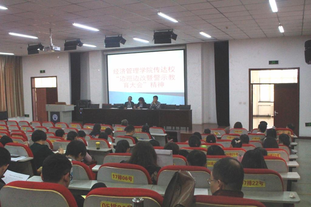 5月21日下午,学院在经管楼二层报告厅召开全院教职工大会,传达学校边巡边改暨警示教育大会精神,全体院领导和教职工参加大会,大会由院党委书记李玮主持。