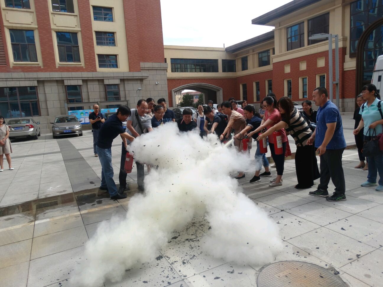 讲座结束后,老师们被邀请到楼下进行消防栓实际操作演练,在关科长的指导下,老师们都学习了灭火器的使用。这次演练真正做到了理论与实践相结合,使老师们对于消防安全防范措施有了更深一步的了解。